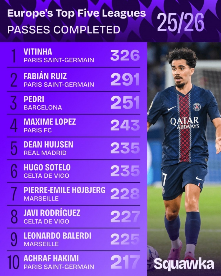9月12日讯 Squawka统计了本赛季球员在五大联赛的成功传球次数,并列出榜单。